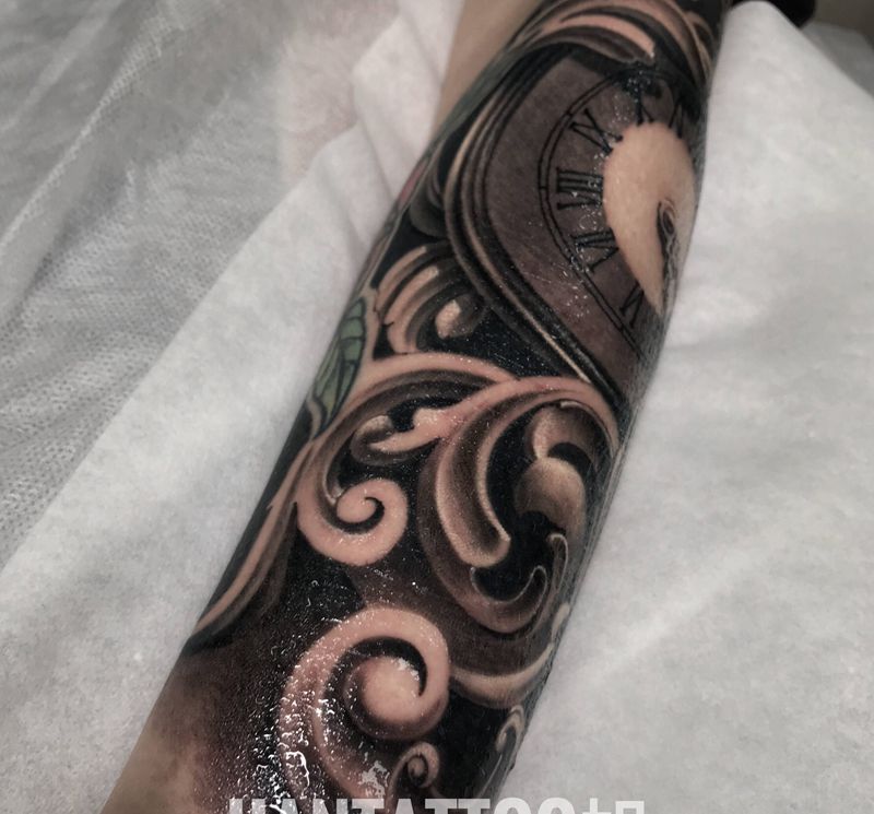 当前位置: 首页 >河北省廊坊市纹身店-韩刺青纹身工作室纹身图案>小臂钟表纹身图片_手臂欧美写实纹身图案