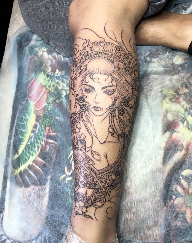 艺妓纹身图片_腿部新传统艺妓纹身图案