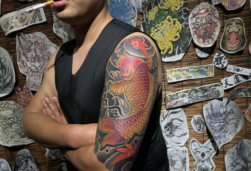 老传统包大臂锦鲤纹身图片_手臂肩部老传统鲤鱼纹身图案
