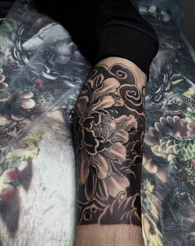 拼接牡丹花纹身图片_腿部老传统牡丹纹身图案