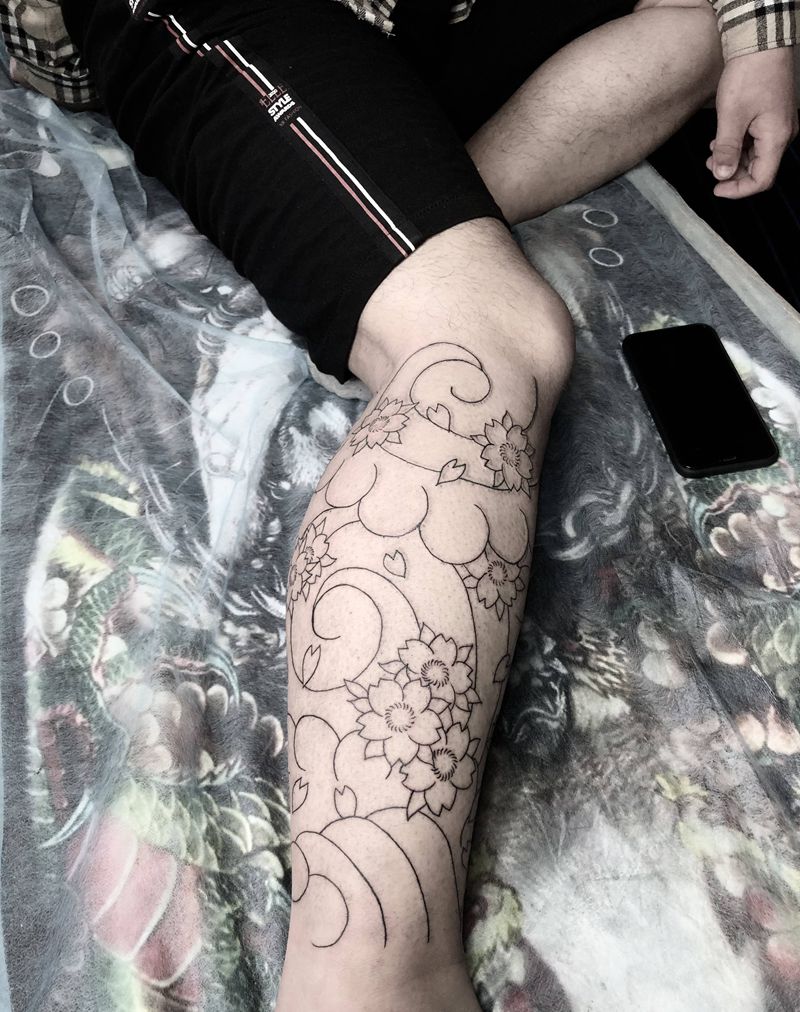 樱花腿纹身图片_腿部老传统樱花纹身图案
