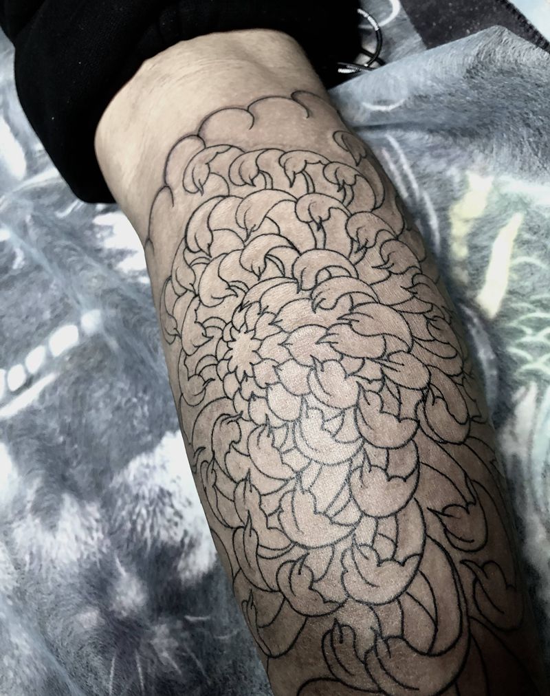 唐狮菊花纹身图片_腿部老传统唐狮菊花纹身图案