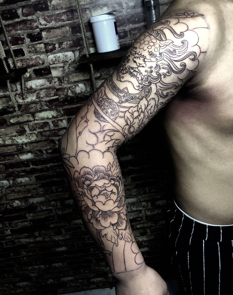 唐狮牡丹纹身图片_手臂老传统唐狮牡丹纹身图案
