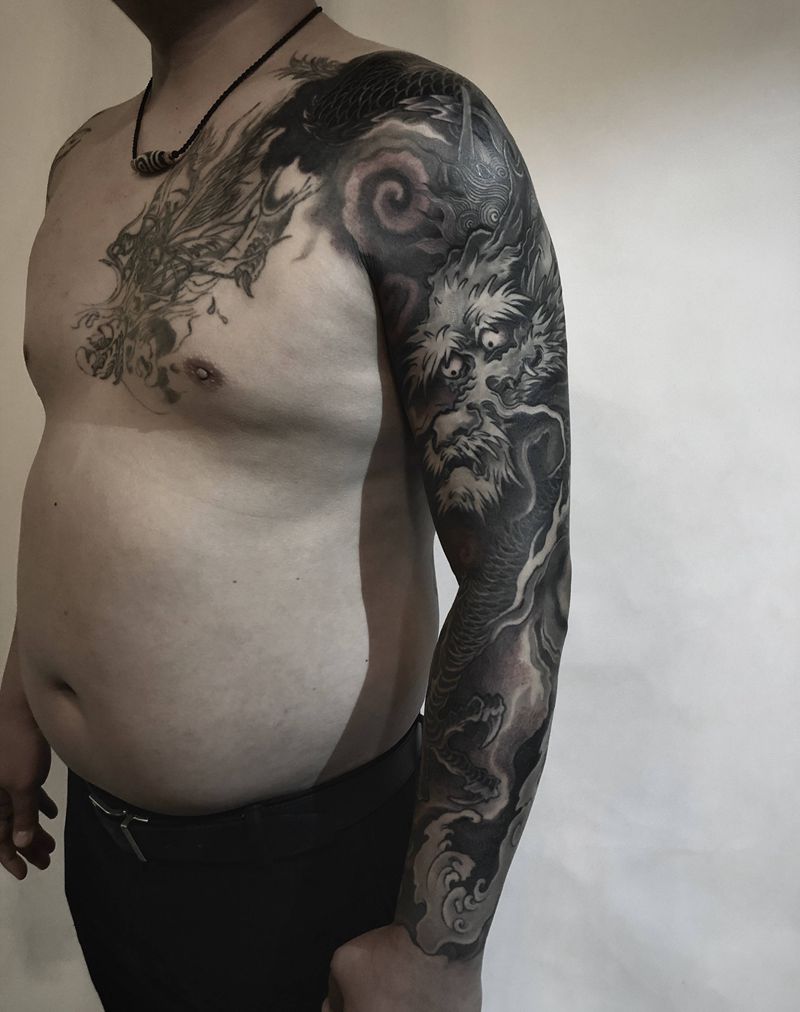 当前位置: 首页 >河北省廊坊市纹身店-灵刺青SpiritTattoo纹身图案>龙纹身图片_手臂新传统龙纹身图案