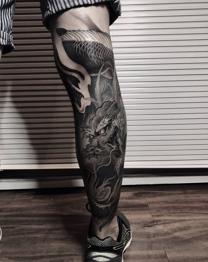 • T网红王老大花腿龙纹身图片_腿部新传统纹身图案
