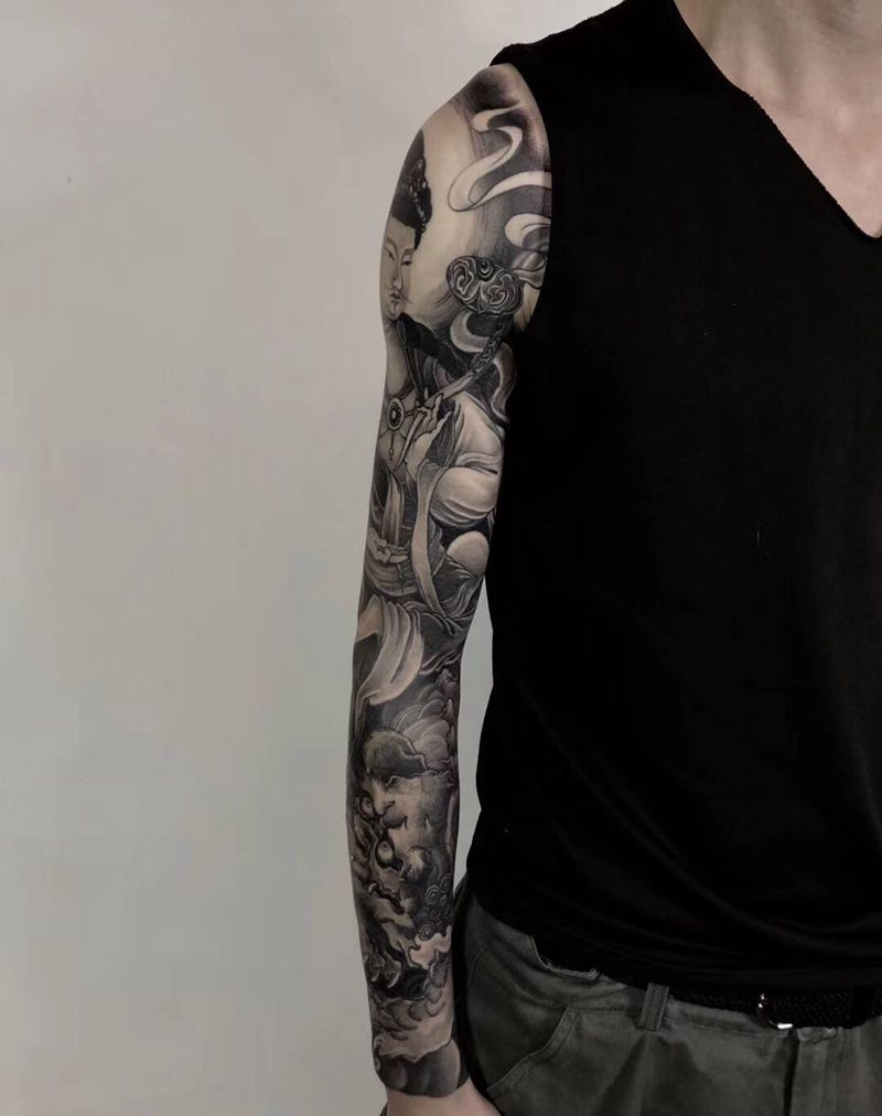 文殊菩萨唐狮纹身图片_手臂新传统文殊菩萨唐狮纹身图案