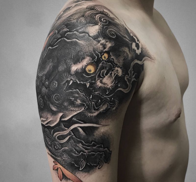 当前位置: 首页 >河北省廊坊市纹身店-灵刺青SpiritTattoo纹身图案>唐狮纹身图片_手臂肩部新传统唐狮纹身图案