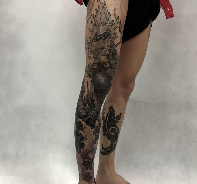 • T网红王老大花腿龙纹身图片_腿部新传统纹身图案