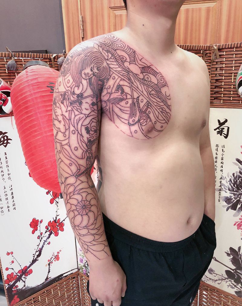 当前位置: 首页 >河北省廊坊市纹身店-莲渡刺青纹身图案>半胛花臂初步线条纹身图片_手臂胸部老传统纹身图案