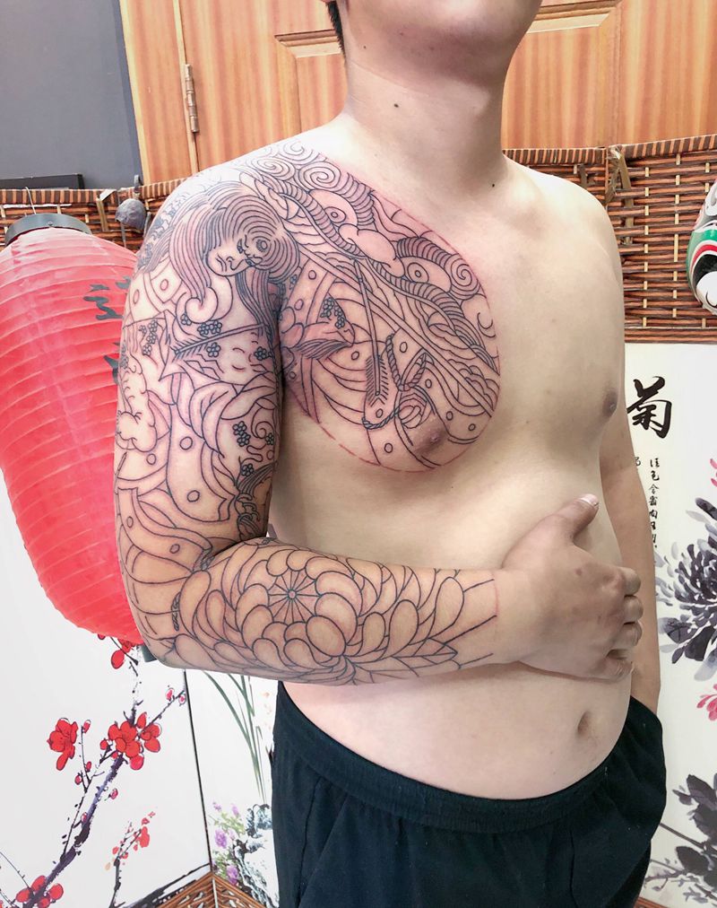当前位置: 首页 >河北省廊坊市纹身店-莲渡刺青纹身图案>半胛花臂初步线条纹身图片_手臂胸部老传统纹身图案