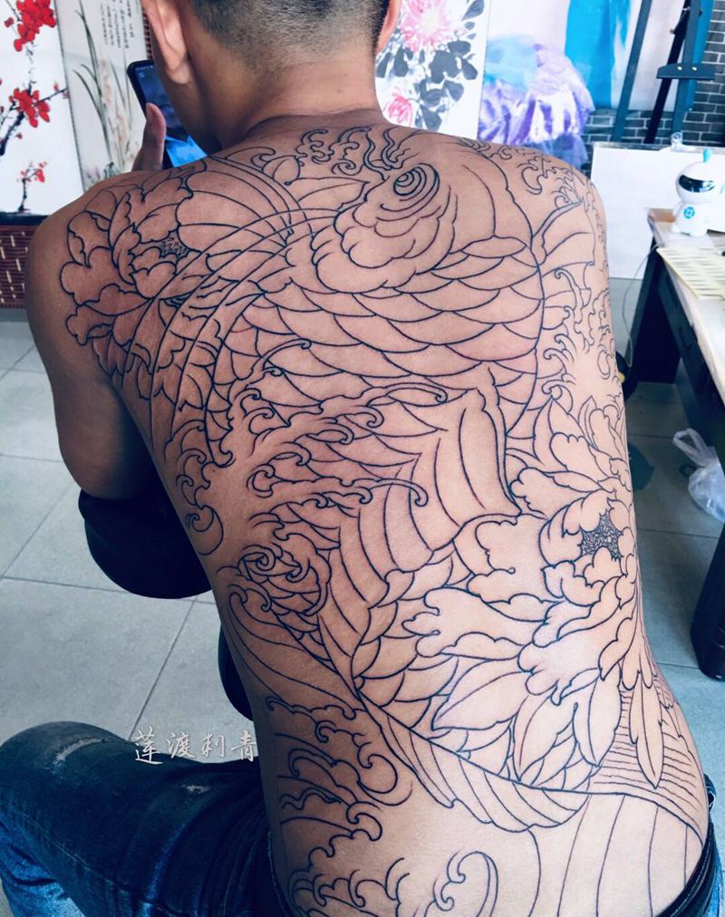 当前位置: 首页 >河北省廊坊市纹身店-莲渡刺青纹身图案>满背鱼线条完成纹身图片_背部腰部新传统纹身图案
