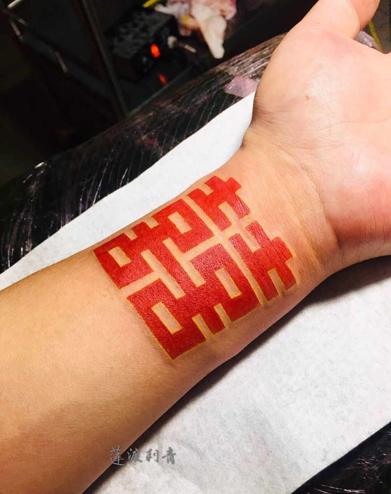 当前位置: 首页 >河北省廊坊市纹身店-莲渡刺青纹身图案>囍纹身图片_手臂新传统纹身图案