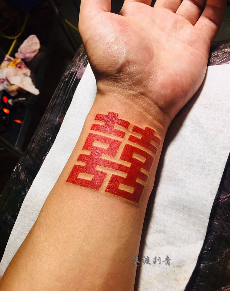 当前位置: 首页 >河北省廊坊市纹身店-莲渡刺青纹身图案>囍纹身图片_手臂新传统纹身图案