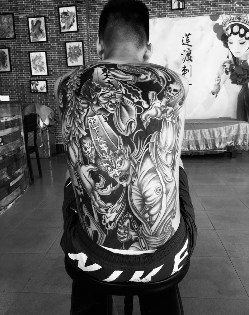 当前位置: 首页 >河北省廊坊市纹身店-莲渡刺青纹身图案>满背黑白无常纹身图片_背部腰部新传统纹身图案