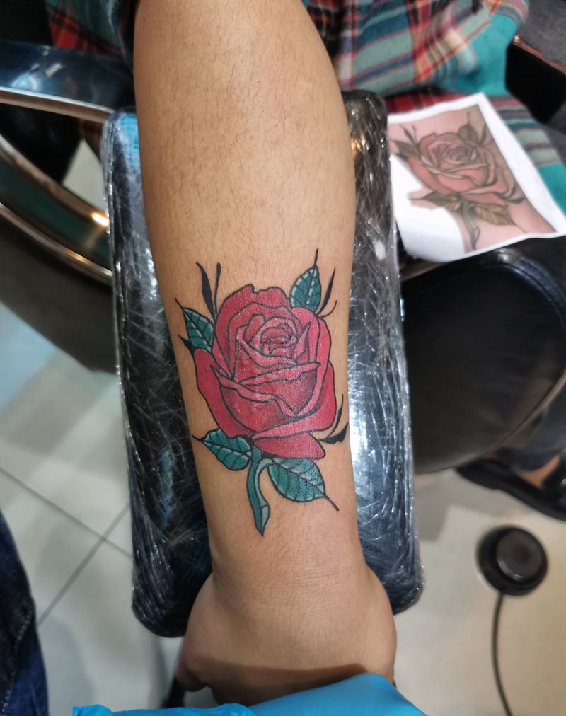当前位置: 首页 >河北省廊坊市纹身店-魅力纹身社纹身图案>玫瑰遮盖疤痕纹身图片_手部手臂老传统纹身图案