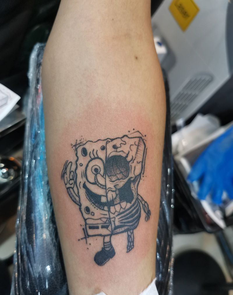 当前位置: 首页 >河北省廊坊市纹身店-魅力纹身社纹身图案>一念之间海绵宝宝版纹身图片_手臂肩部点刺几何纹身图案