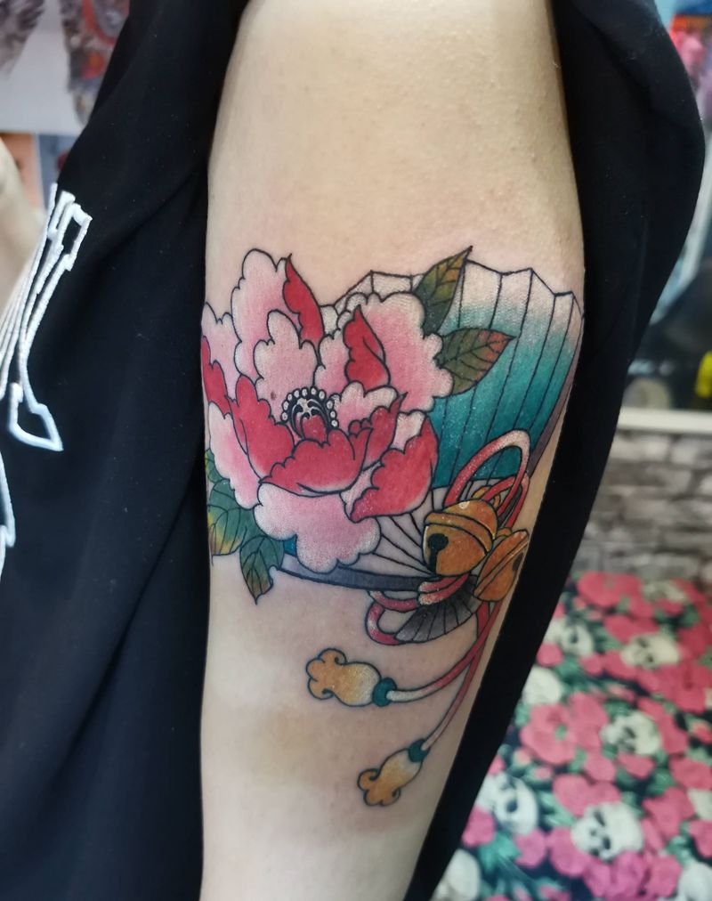 牡丹小扇子纹身图片_手臂肩部New School水彩纹身图案
