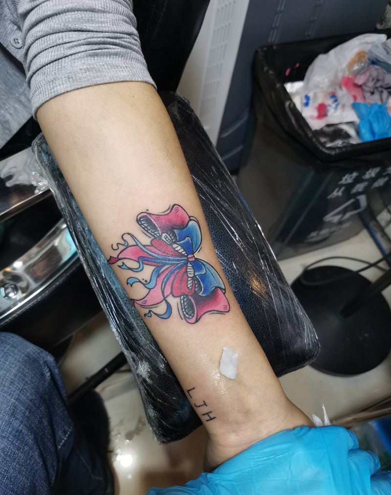 当前位置: 首页 >河北省廊坊市纹身店-魅力纹身社纹身图案>蝴蝶结遮盖字母纹身图片_手臂手部新传统水彩纹身图案