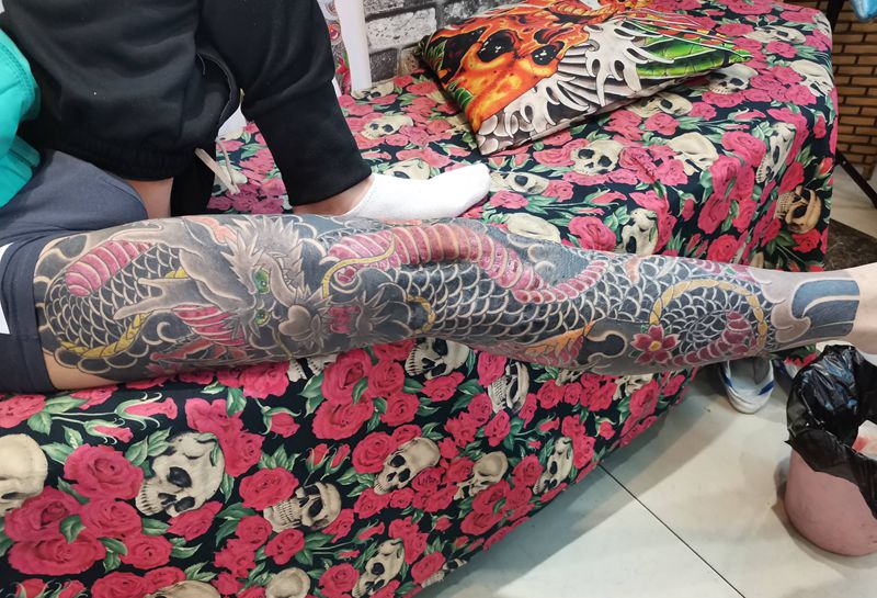 • T网红王老大花腿龙纹身图片_腿部新传统纹身图案