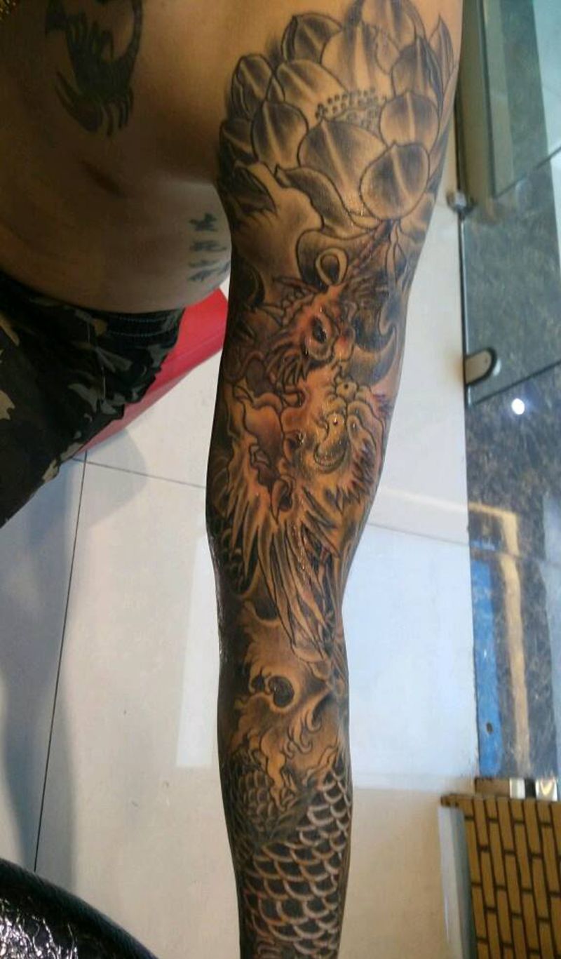 • T网红王老大花腿龙纹身图片_腿部新传统纹身图案