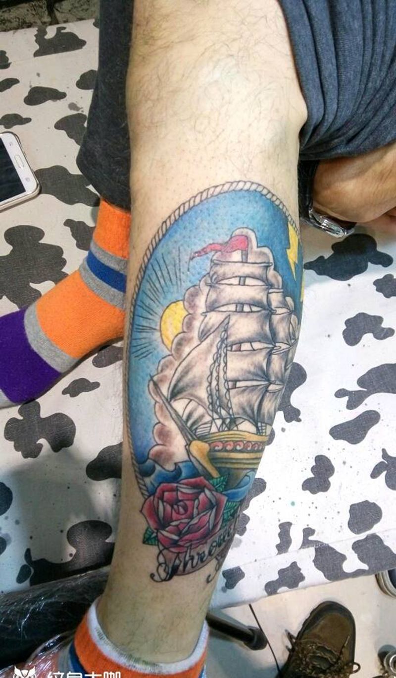 • T包小腿吹火男+阿多福纹身图片_腿部老传统新传统吹火男阿