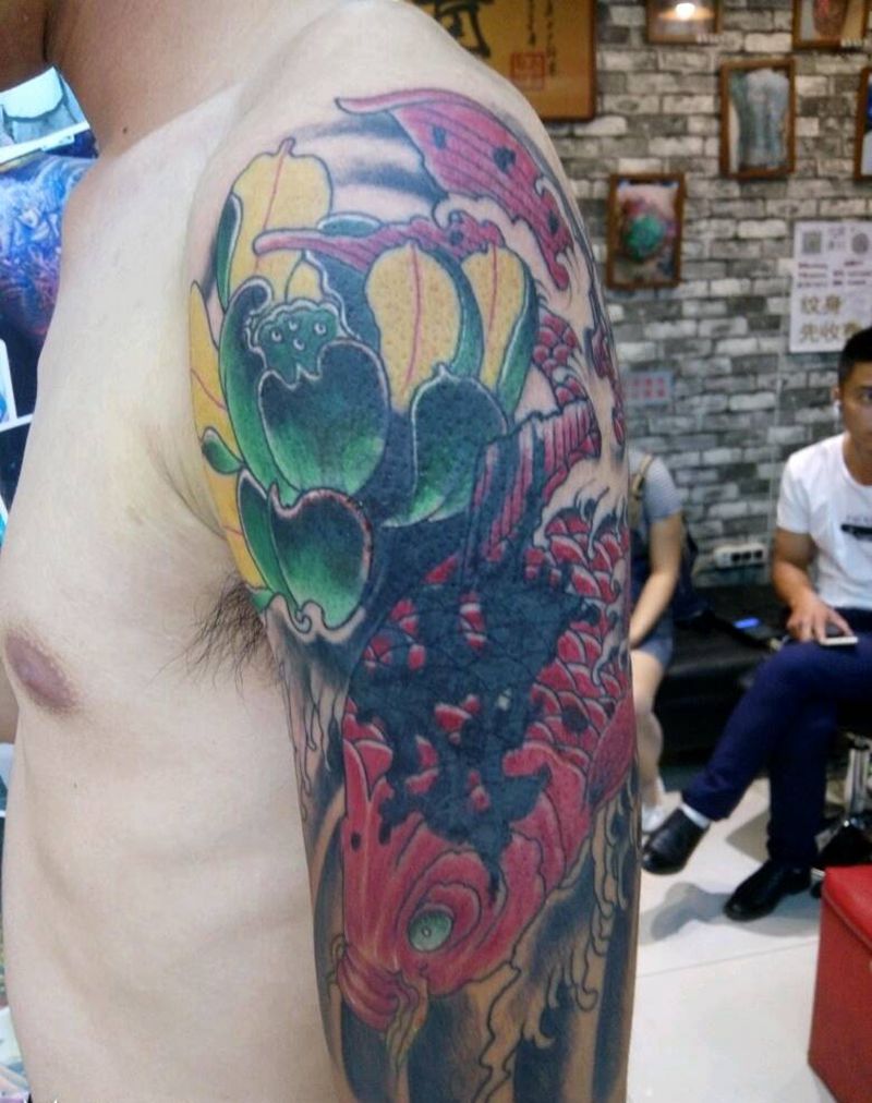 当前位置: 首页 >河北省廊坊市纹身店-魅力纹身社纹身图案>鲤鱼荷花遮盖,原来是图腾。纹身图片