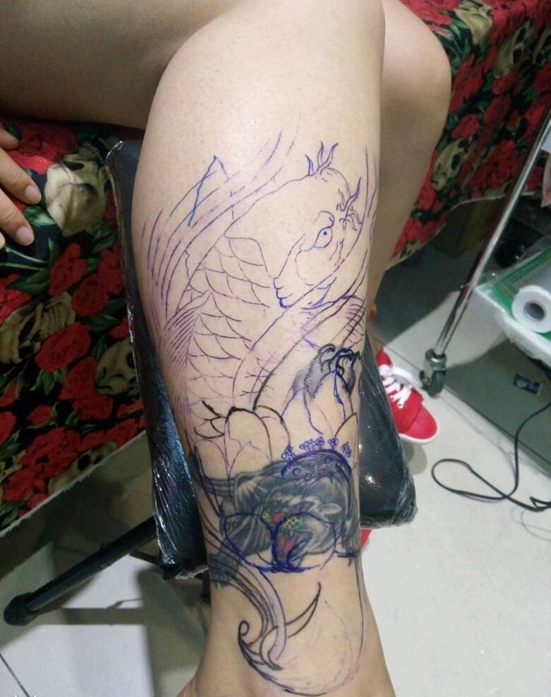 当前位置: 首页 >河北省廊坊市纹身店-魅力纹身社纹身图案>鲤鱼荷花遮盖纹身图片