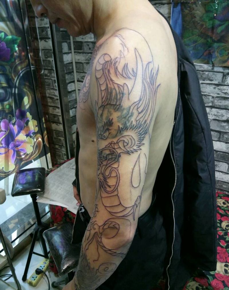 • T网红王老大花腿龙纹身图片_腿部新传统纹身图案