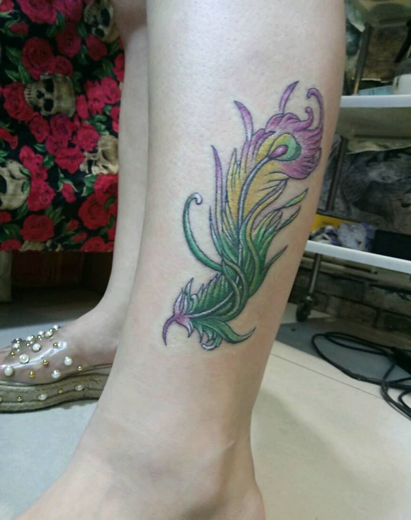 羽毛彩色纹身图片_腿部传统动物廊坊纹身成品纹身图案