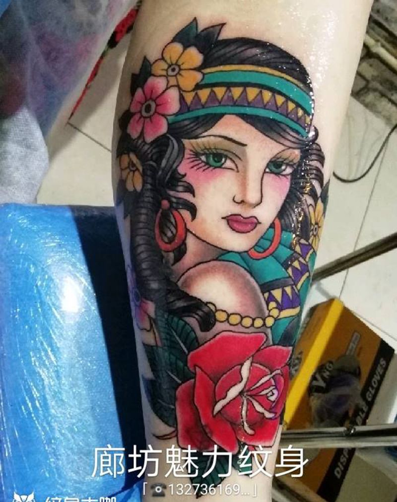 遮盖作品纹身图片_腿部欧美传统人物廊坊纹身成品纹身图案