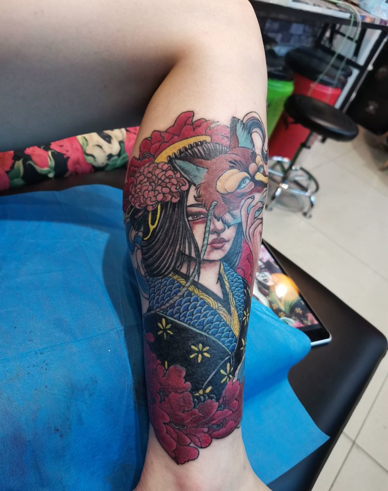 当前位置: 首页 >河北省廊坊市纹身店-魅力纹身社纹身图案>艺伎遮盖纹身图片_腿部手臂新传统纹身图案