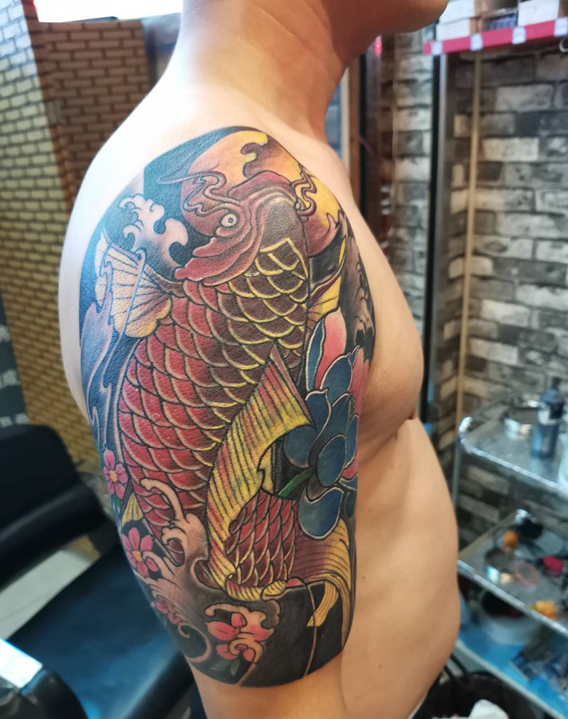 当前位置: 首页 >河北省廊坊市纹身店-魅力纹身社纹身图案>鲤鱼遮盖纹身图片_肩部腿部老传统新传统纹身图案