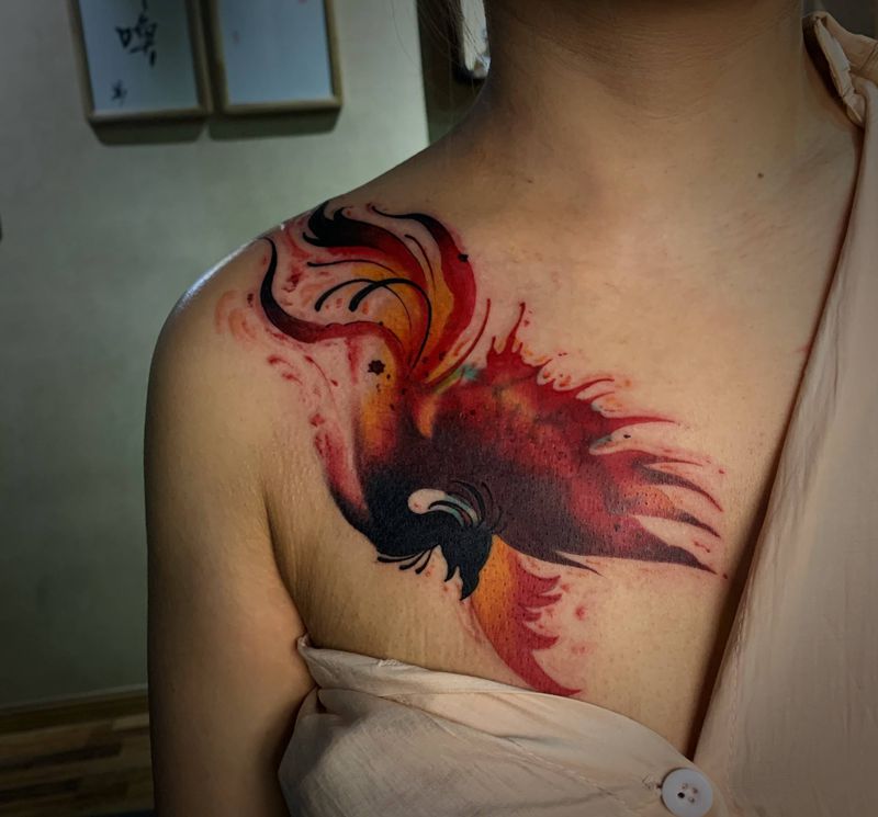 当前位置: 首页 >河北省廊坊市纹身店-霸州萬刺青纹身图案>凤凰纹身图片_肩部水彩水墨凤凰纹身图案