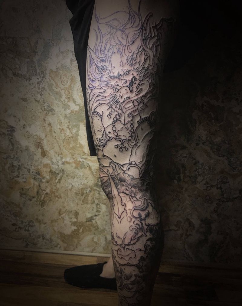 花腿 未完成纹身图片_腿部新传统雷神唐狮花腿纹身图案