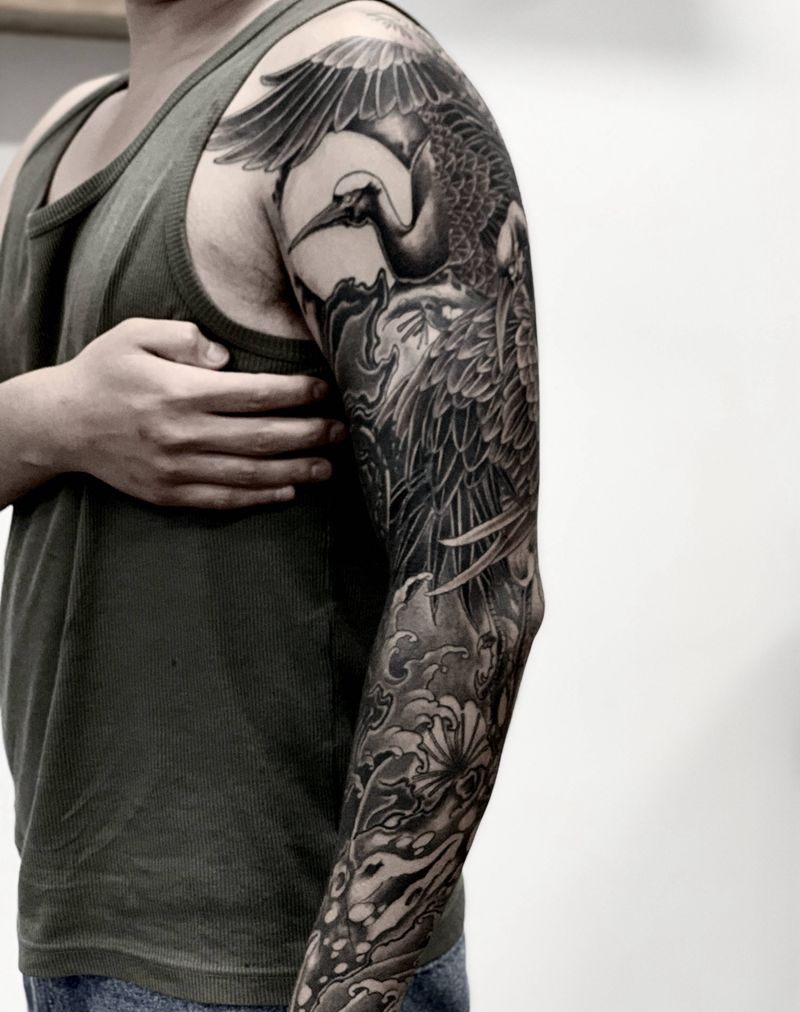 当前位置: 首页 >河北省沧州市纹身店-京南刺青纹身图案>花臂仙鹤遮盖作品未完待续纹身图片_手臂新传统纹身图案