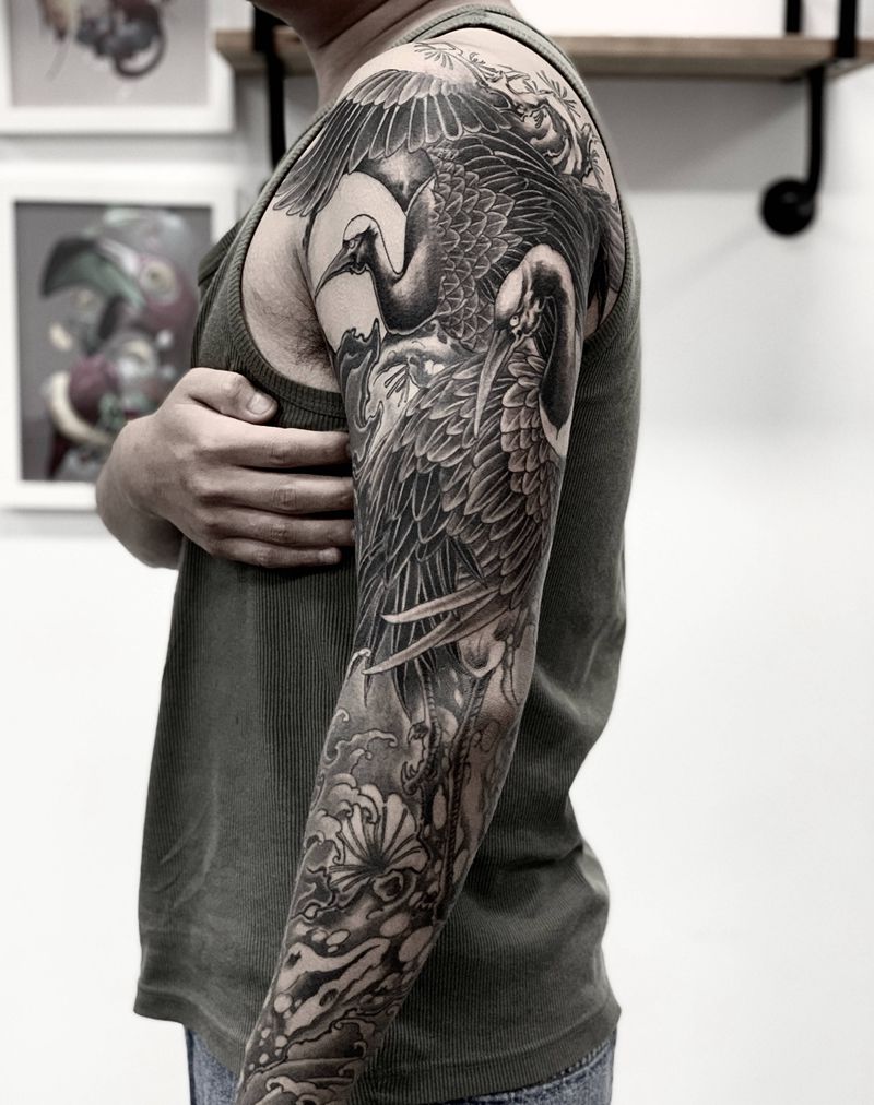 当前位置: 首页 >河北省沧州市纹身店-京南刺青纹身图案>花臂仙鹤遮盖作品未完待续纹身图片_手臂新传统纹身图案