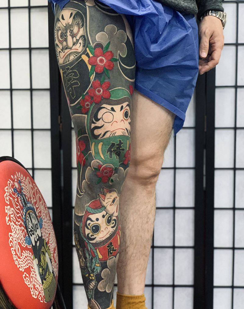 当前位置: 首页 >河北省沧州市纹身店-京南刺青纹身图案>达摩蛋花腿纹身图片_腿部老传统纹身图案