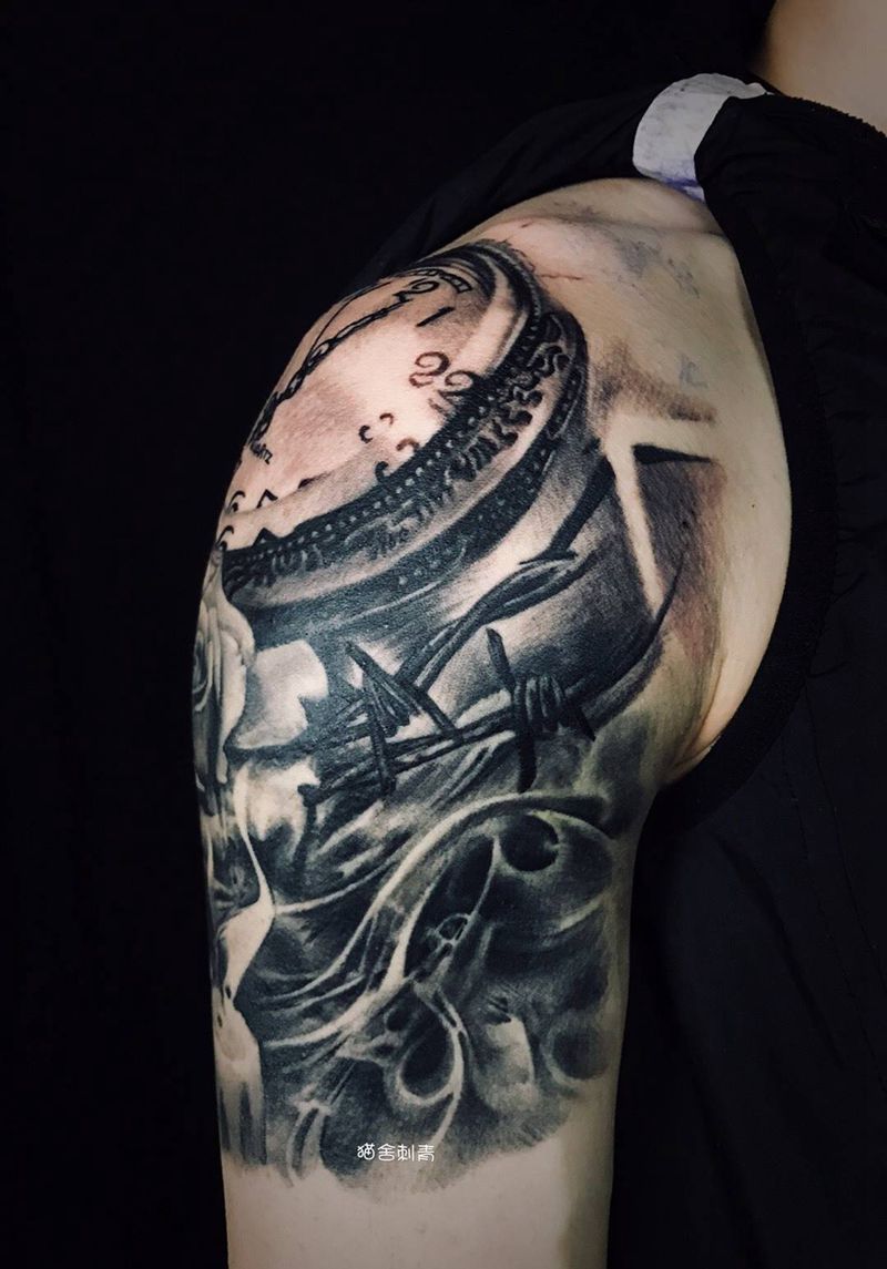 当前位置: 首页 >河北省衡水市纹身店-猫舍刺青纹身图案>半臂钟表图纹身图片