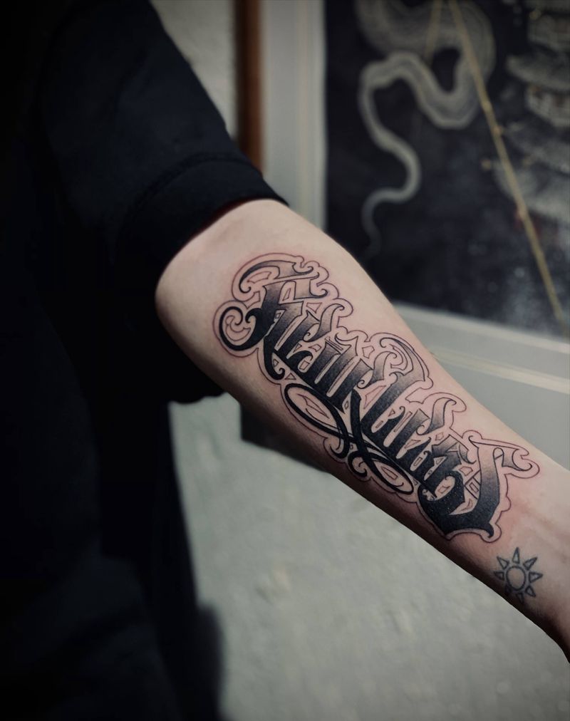 当前位置: 首页 >山西省太原市纹身店-太原翰墨刺青纹身图案>哥特花体字纹身图片_手臂纹身图案