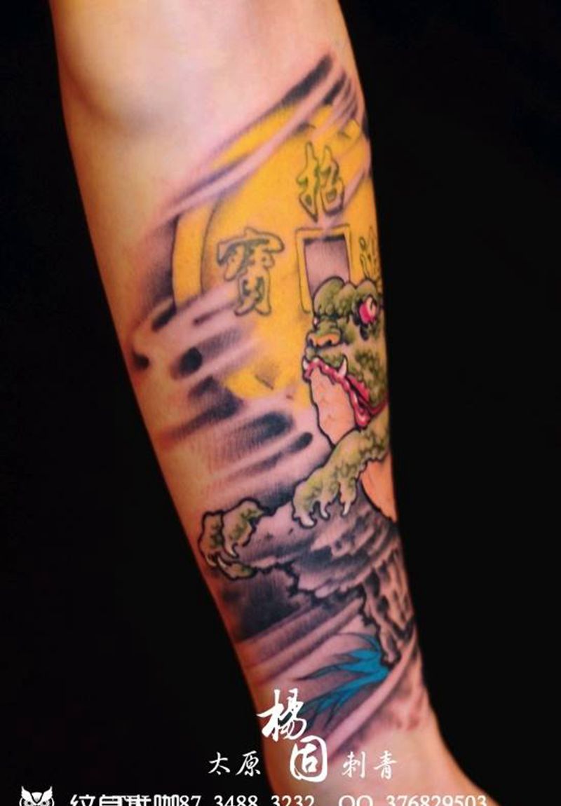 当前位置: 首页 >山西省太原市纹身店-太原杨固刺青工作室纹身图案>金蟾纹身图片_手臂传统习俗国画动物原创成品手稿纹身图案