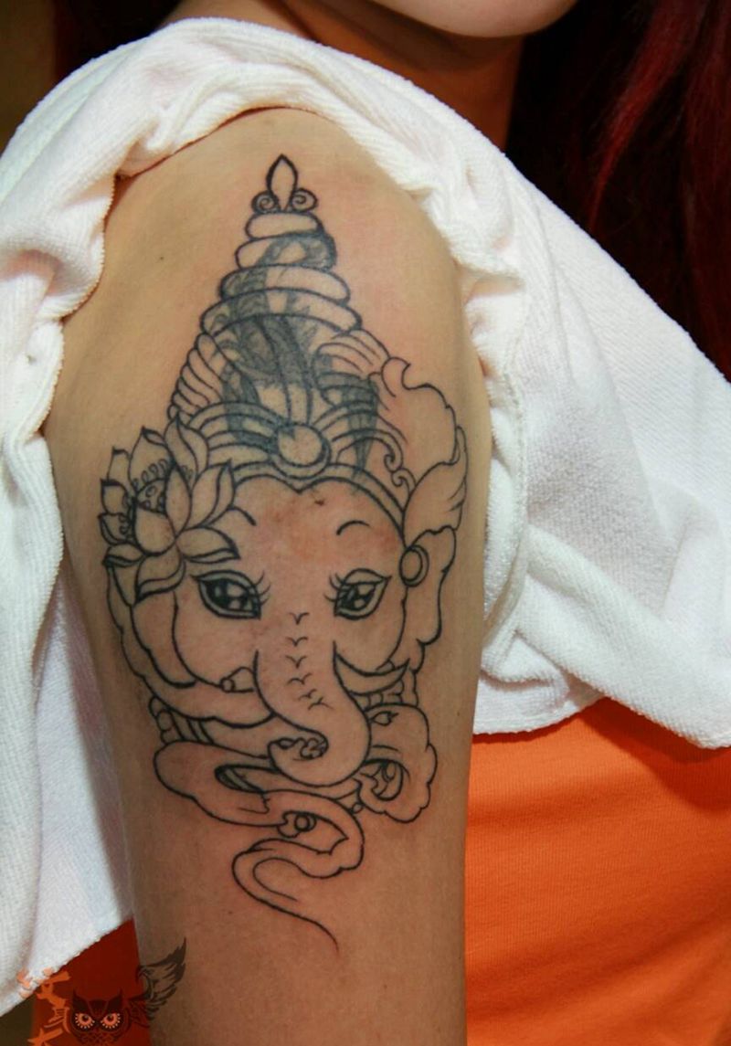 当前位置: 首页 >山西省太原市纹身店-太原翼龙刺青工作室纹身图案>可爱的招财象神MM纹身图片_肩部手臂欧美动物鬼神纹身图案