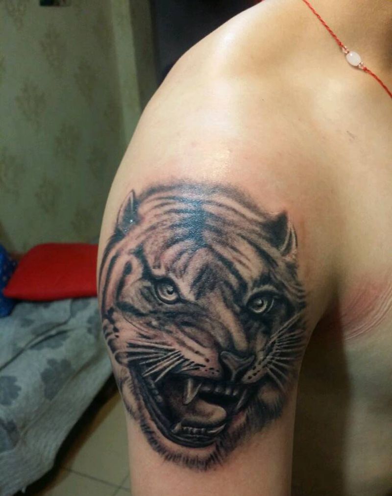 当前位置: 首页 >山西省太原市纹身店-太原翼龙刺青工作室纹身图案>虎啸纹身图片_肩部背部手臂传统习俗国画动物原创成品纹身图案