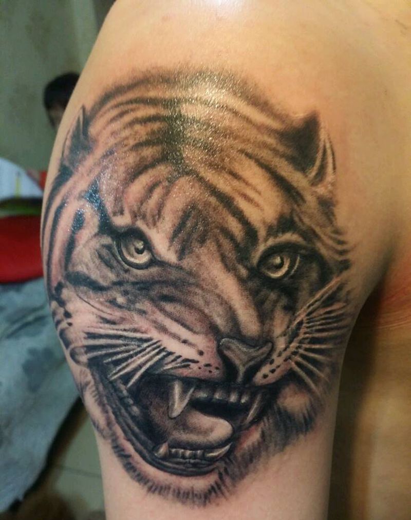 当前位置: 首页 >山西省太原市纹身店-太原翼龙刺青工作室纹身图案>虎啸纹身图片_肩部背部手臂传统习俗国画动物原创成品纹身图案