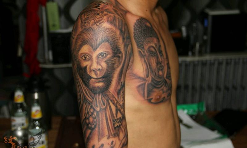 美猴王会如来佛祖纹身图片_肩部手臂传统肖像写实人物原创纹身图案