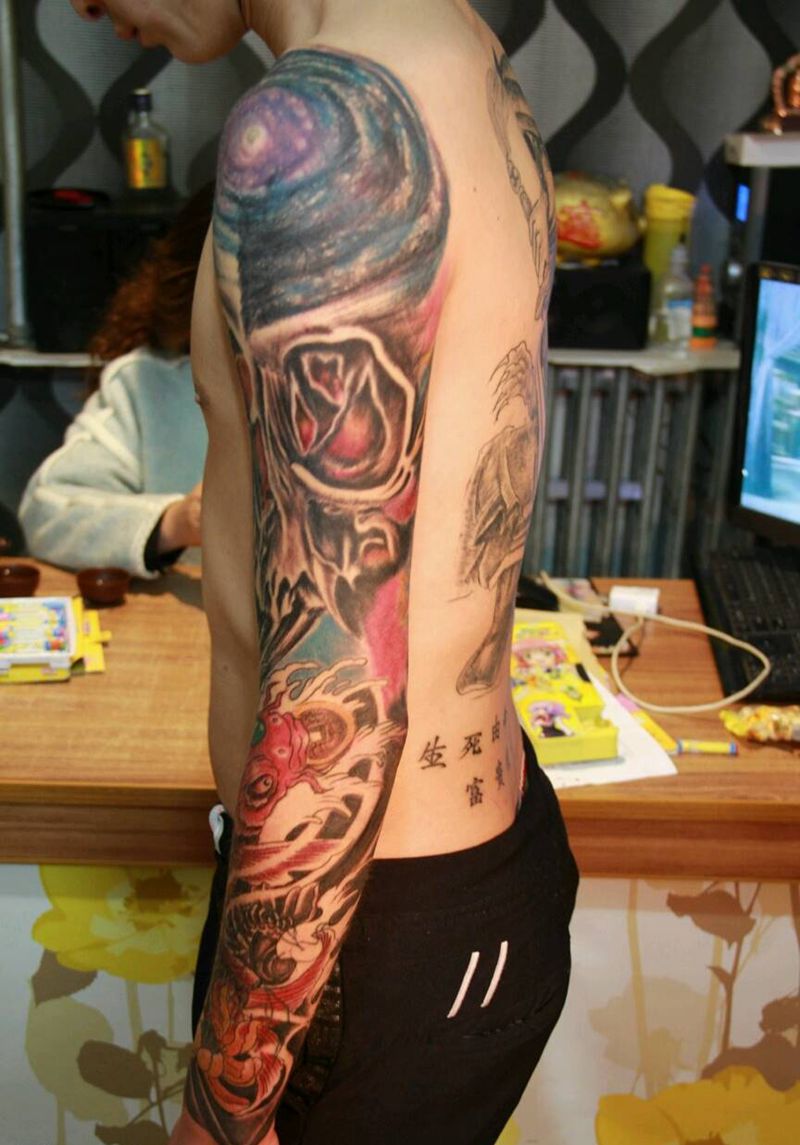银河系彩色花臂遮盖纹身纹身图片_肩部手臂手部欧美传统习俗几何动物鬼神原创纹身图案