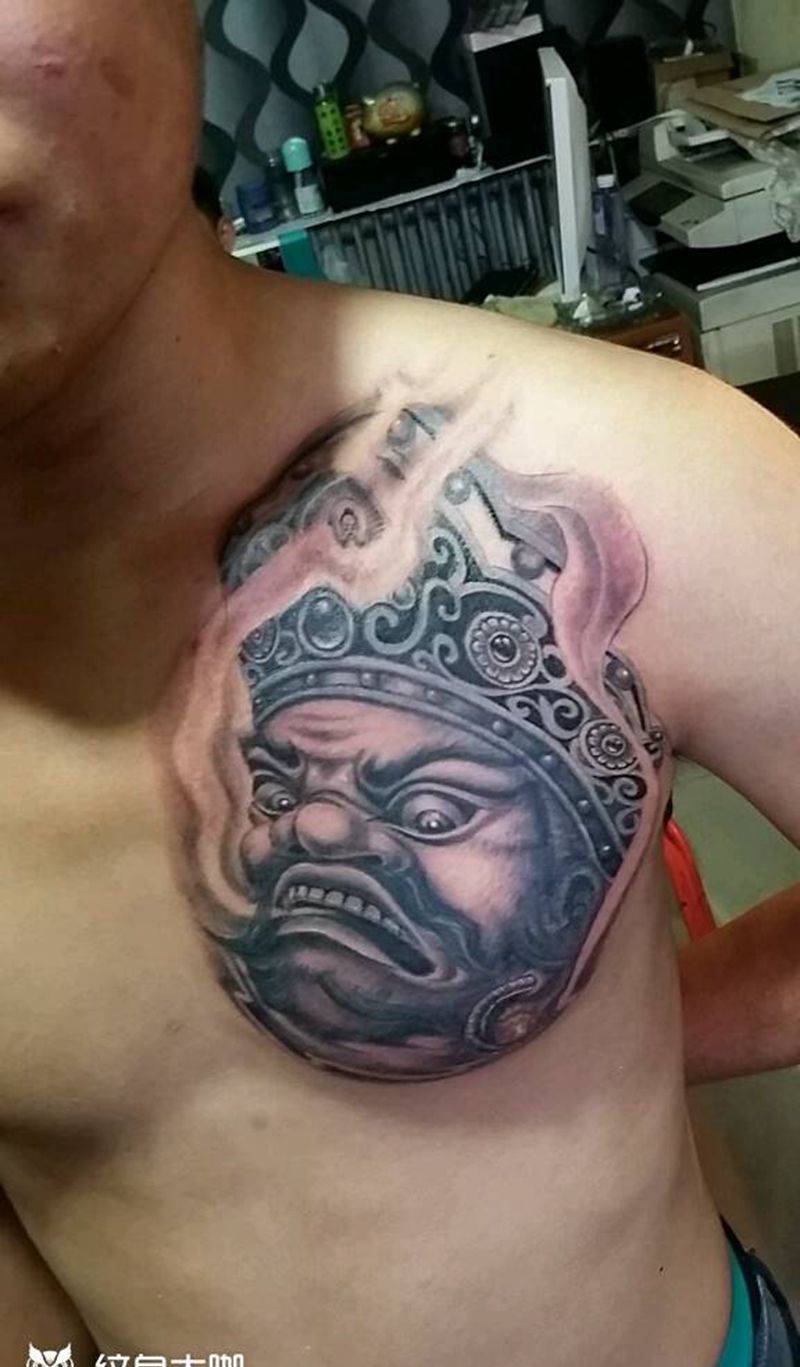 四大天王之一纹身图片_胸部传统人物鬼神成品纹身图案