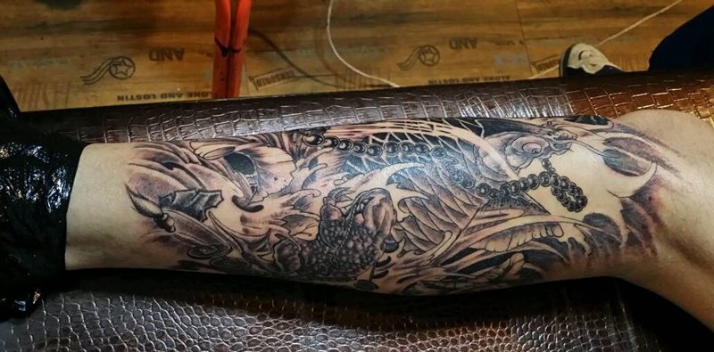 当前位置: 首页 >山西省太原市纹身店-太原翼龙刺青工作室纹身图案>招财锦鲤戏金蟾纹身图片_腿部传统动物成品纹身图案