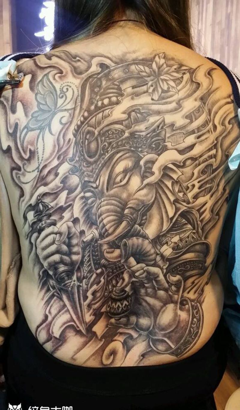 象神完工纹身图片_背部传统动物鬼神宗教成品纹身图案