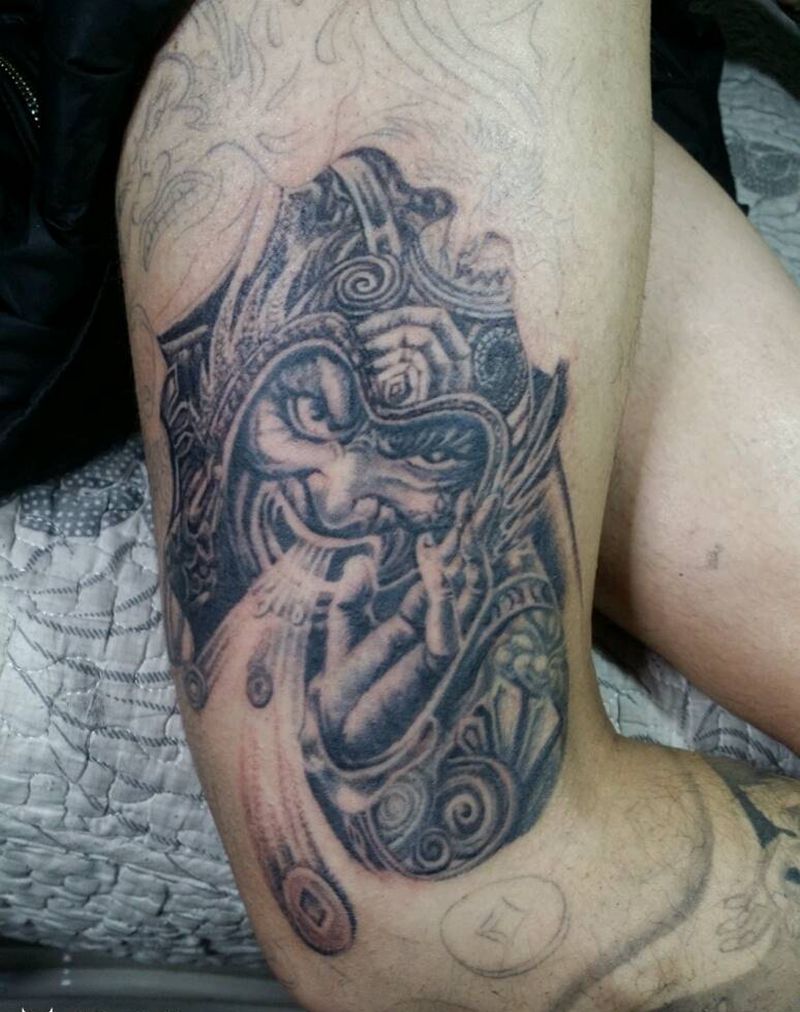 当前位置: 首页 >山西省太原市纹身店-太原翼龙刺青工作室纹身图案>哼哈二将纹身图片_腿部传统人物鬼神成品手稿纹身图案