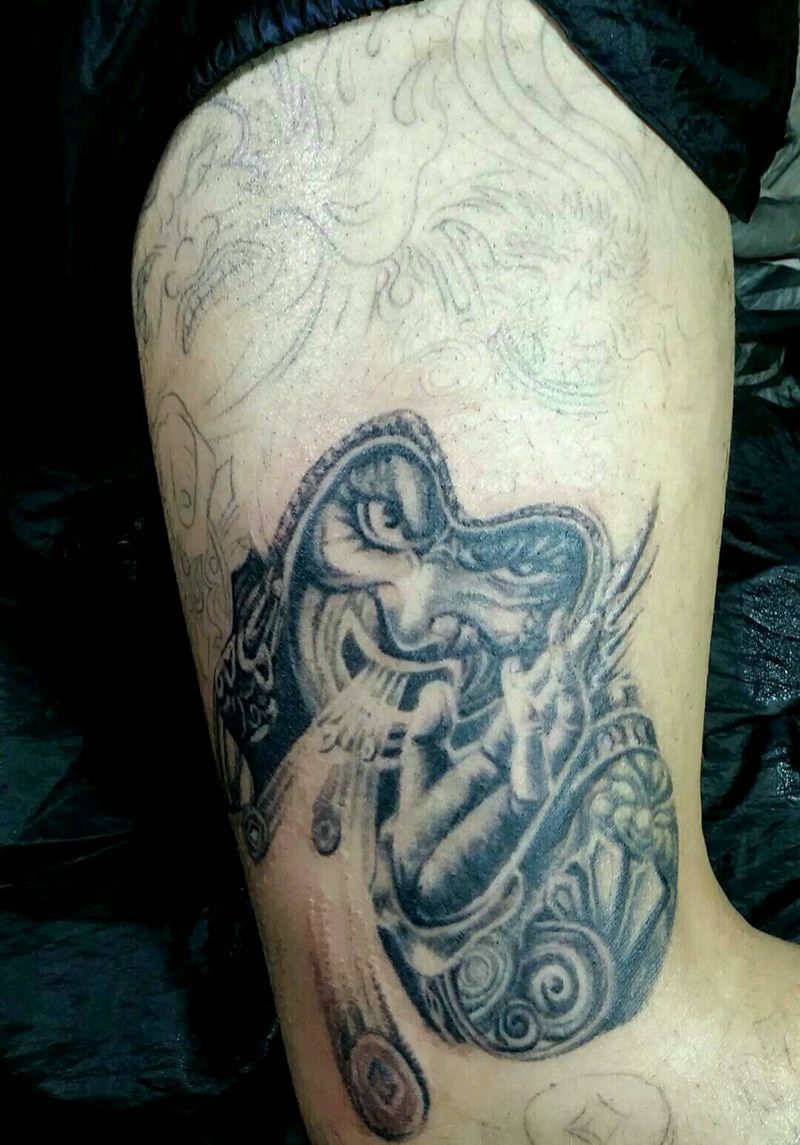 当前位置: 首页 >山西省太原市纹身店-太原翼龙刺青工作室纹身图案>哼哈二将纹身图片_腿部传统人物鬼神成品手稿纹身图案